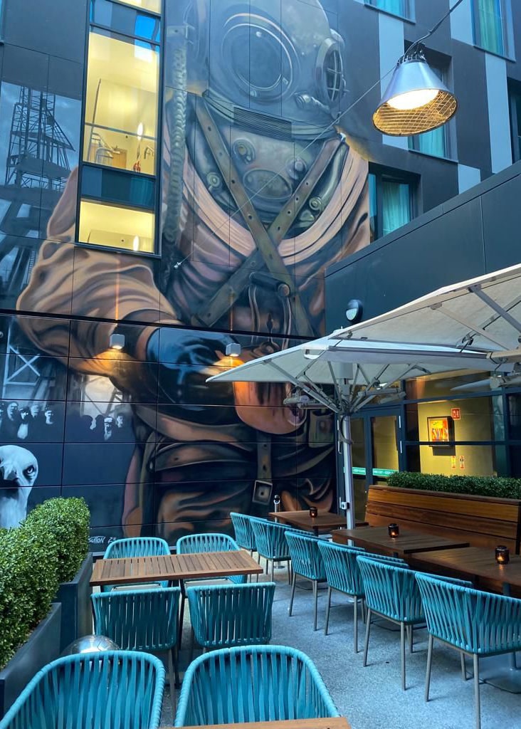 Admire the bespoke mural by Irish artist Shane Sutton, featuring a 19th-century diving bell helmet that pays homage to the docklands area. Ideal for small corporate events or gatherings, our terrace combines comfort, artistry, and nature.